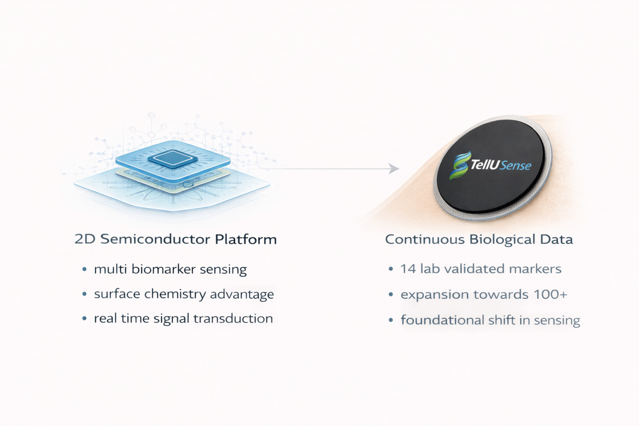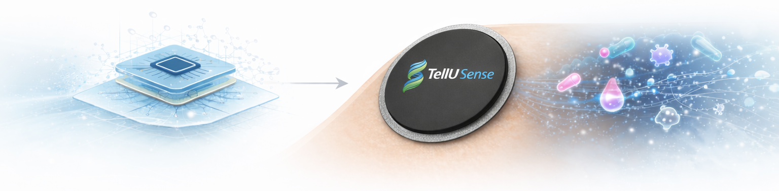 The TellU Sense device is the first commercial expression of the NPT platform — a wearable biosensor that reads multiple biological signals in real time through sweat, with a clear pathway to FDA-grade microneedle devices.